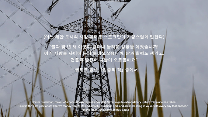 <우리는 우리가 말할 수 있는 것 이상으로 알고 있다>는 충청남도 당진이라는 도시와 한 인물의 삶의 궤적을 촘촘히 엮어낸다. 영상 속에서는 역사 전문가, 바닷가 아이, 심마니, 김 양식업자, 청년 농부 등 당진에 거주하는 17명의 화자(storyteller)가 교차하며 이야기를 전한다. 작가는 실화 기반의 생애사를 따라가며 일제강점기 금광에서부터 오늘날 폐자원에 이르기까지, 도시 인프라와 자원을 둘러싼 근현대사를 추적한다. 본 작업의 부제이자 영감이 된 헨리 입센의 연극 『민중의 적』(1882)은 마을의 온천수가 인근 공장 폐수로 오염된 사실을 공론화하는 주인공의 고난과 신념을 담고 있다.