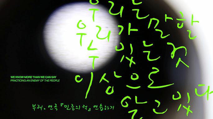 우리는 우리가 말할 수 있는 것 이상으로 알고 있다: 연극 『민중의 적』연습하기, 2026, 단채널 영상, 33min